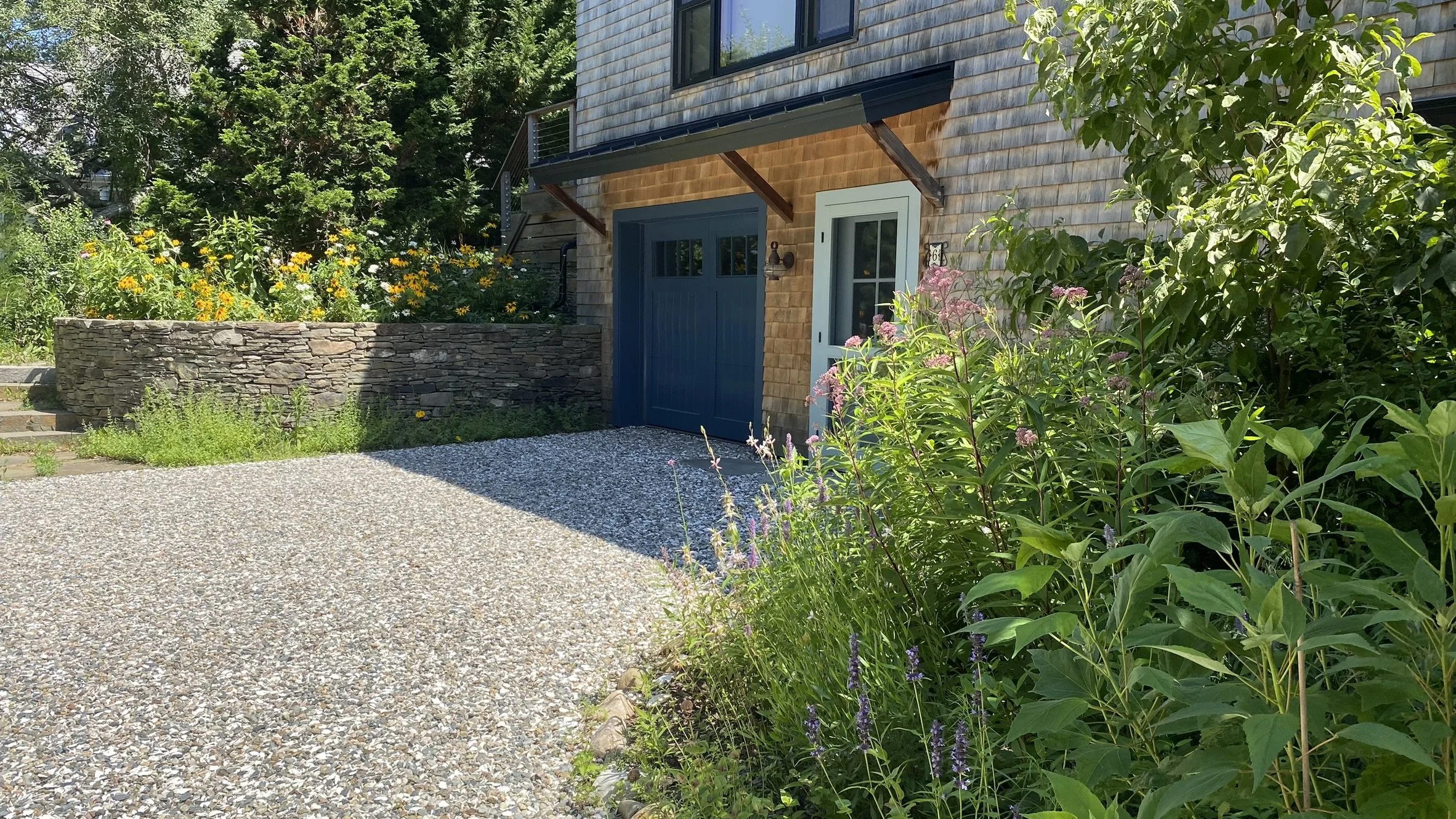 Colorful perennial beds ring the driveway and path to the front door. An easy to maintain hedge of clethra and hydrangeas were planted in the foundation of the rest of the home.
