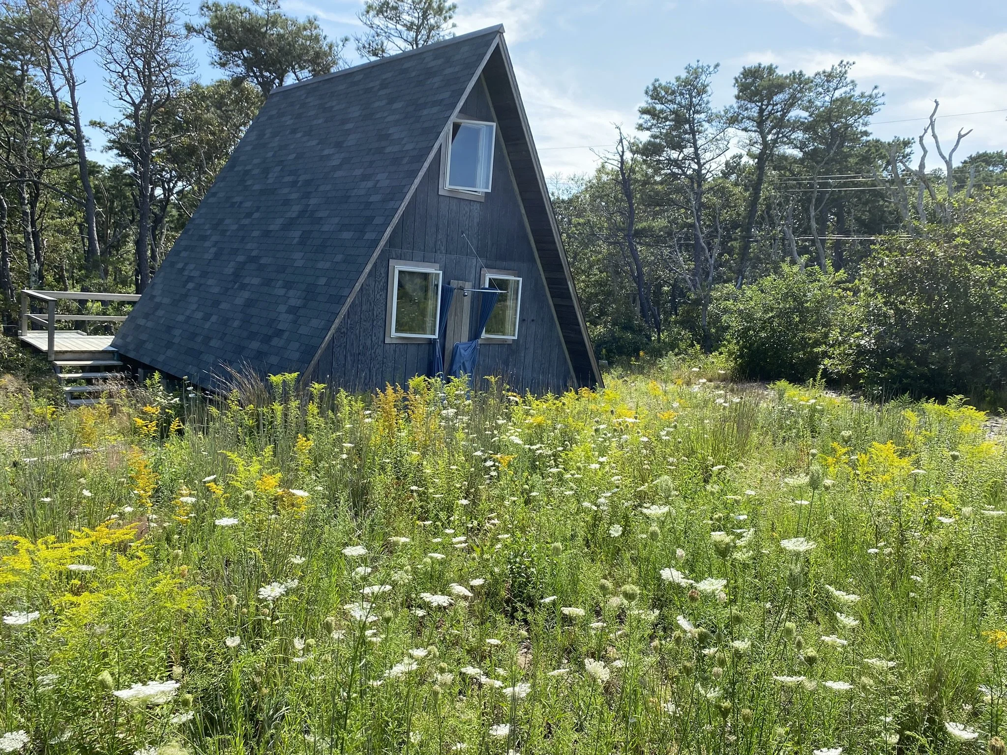 Built in 1961 by the prolific local builder Luther Crowell, the Kholberg house and A-Frame cottage sit in the woods about one hundred yards from the dune’s edge. Abandoned for almost two decades within the Cape Cod National Seashore and restored by the Cape Cod Modernist house trust in 2019, the landscape design responds to the need to carve out space for access and utilities within the dense and changing woodland site.