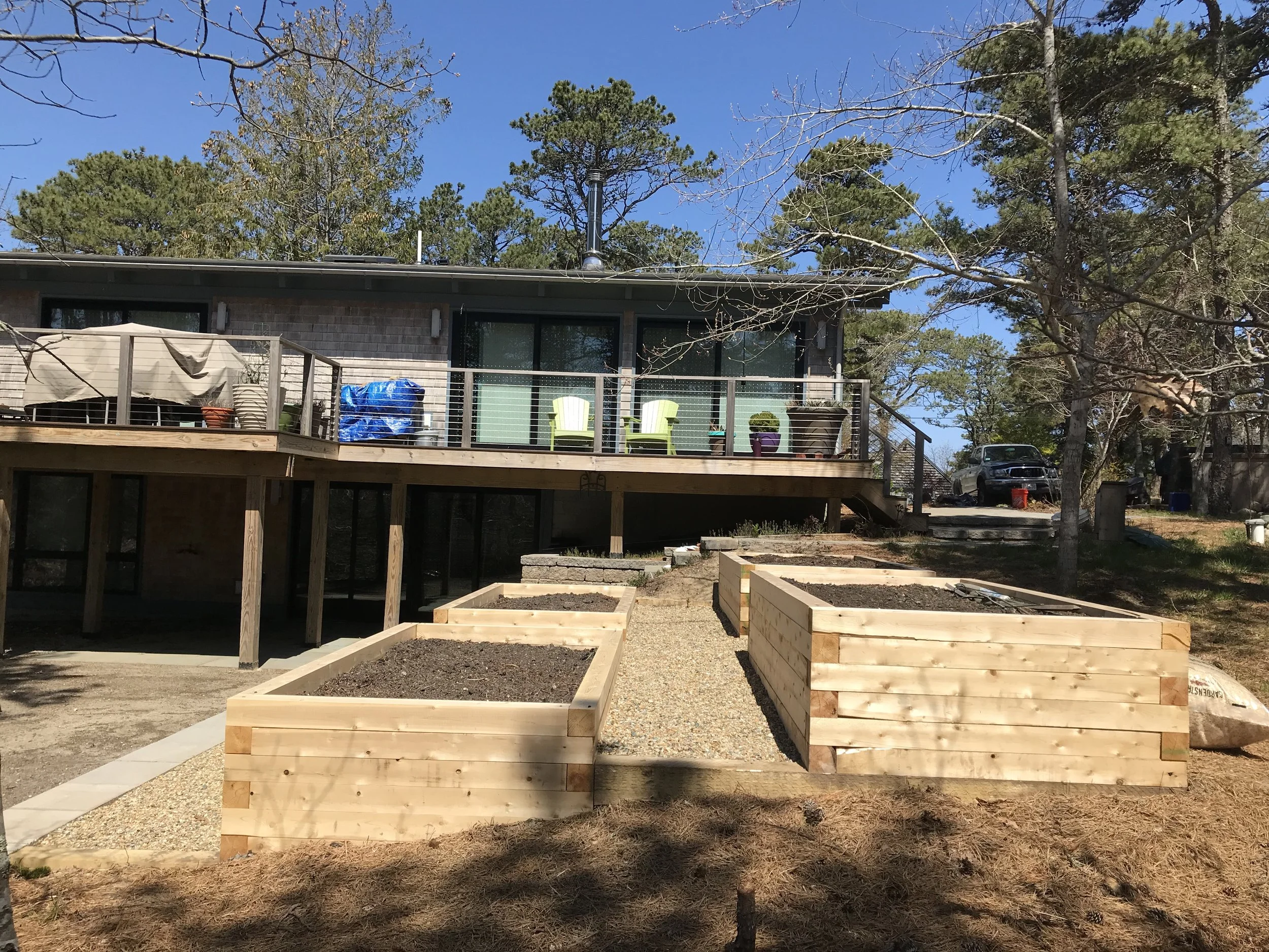 We terraced a sloping backyard into edible gardens and a family lawn area. We also constructed a retaining wall and driveway edging, a new lower driveway, and a bioswale at a low point that collects water from the street.